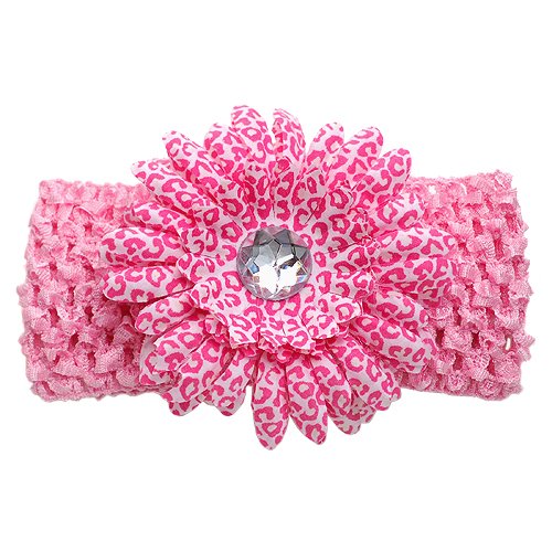 Pink crochet hairband with pink and white leopard print gerbera daisy flower by Reflectionz. Your sweet baby or toddler can wear this comfortably as it is very soft and stretchy. Flower has rhinestone center. Please use supervision with your child when using this item. The flower measure approximately 4".