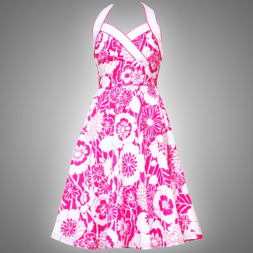 Beautiful FUCHSIA-PINK & WHITE 'Wild Flower' PRINT HALTER DRESS features sleeveless bodice with CROSS-OVER SWEETHEART NECKLINE and KNOT-TIE SHOULDER STRAPS behind the neck. Fully lined, below-knee-length FUCHSIA-PINK & WHITE SKIRT features MIXED 'Wild Flower' PRINT with back zip closure and STRETCHABLE BAND IN BACK for comfortable fit plus BOW TIE SASH IN BACK for perfect fit. Machine washable. Imported (El Salvador). Of 100% cotton - Lining of polyester/cotton - Exclusive of trim/decoration. Matching/Coordinating sister styles available in sizes 7-16, search for style(s): RRE-38821. More baby & girl party dresses available, search for: " rre-girl-party-dress "